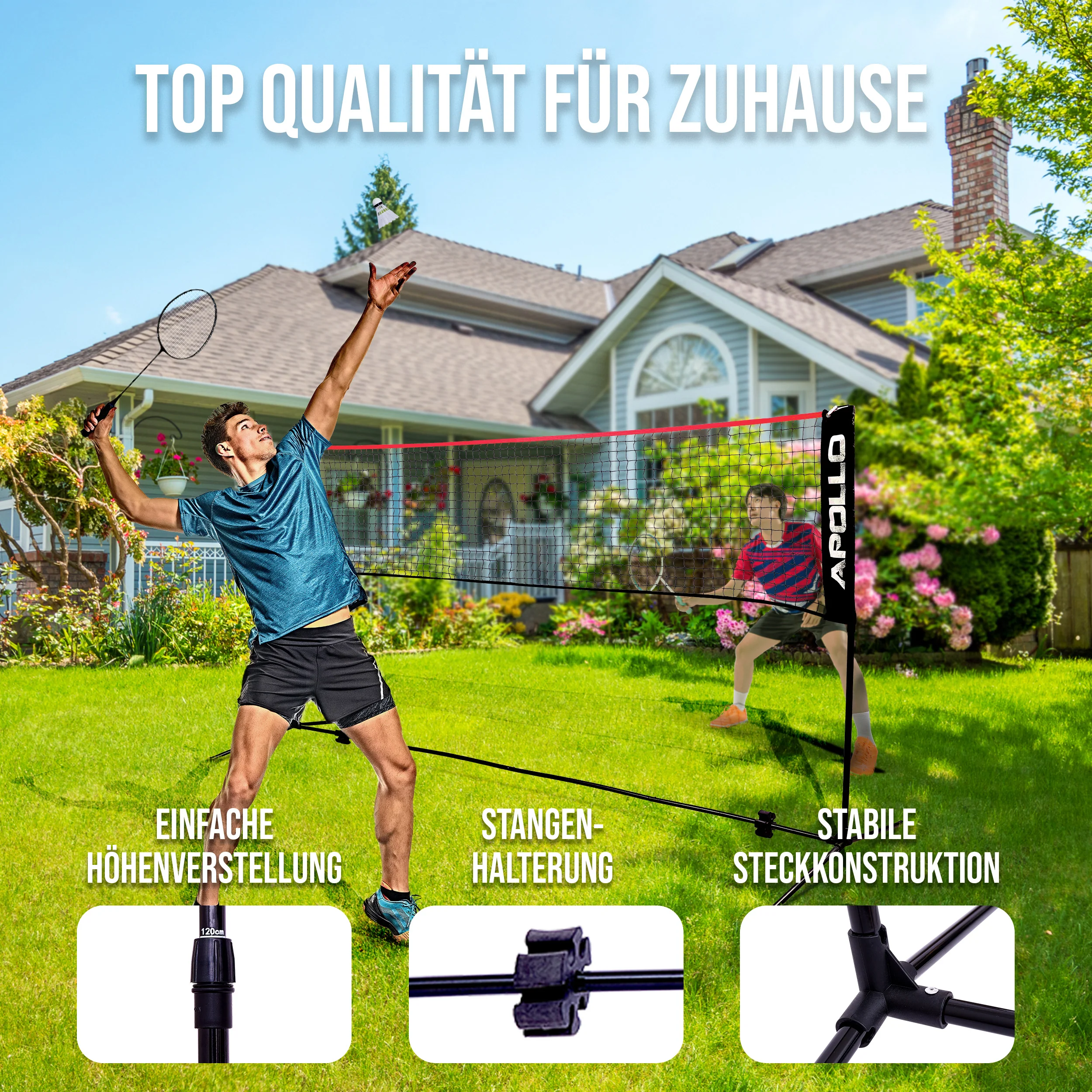 Dank der Höhenverstellung des Netzes können Sie wählen auf welche Ballsportart Sie und Ihre Lieben gerade Lust haben! Federball, Volleyball, Badminton, Beachball und Soccer – mit dem Apollo Multisportnetz ist alles möglich.